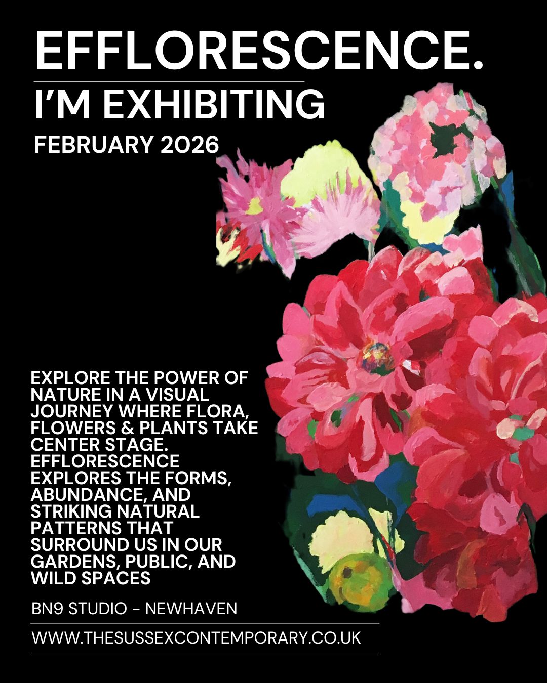 Returning to the BN9 Studio in Newhaven in February 2026 with Efflorescence, a national democratic exhibition of works celebrating the visual aspect of flowers, flora, and plants as they emerge and display their beauty.